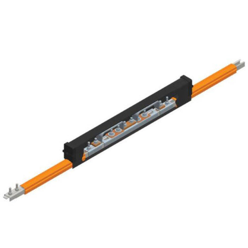 This is an expansion section with a splice installed. This section has a standard phase cover (orange), and is rated at 100 Amps. This is to be used at structural expansion joints.